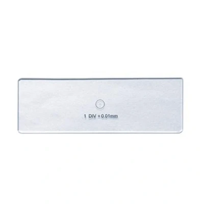 Division:0.01mm. Material: optical glass Used as a calibration slide. Usually, this is a glass slide with one one-hundredth of a millimeter, 0.01mm, engraved on to its top surface. Since a hundredth of a millimeter is very small and difficult to see, a circle is drawn around it. Total length of scale is 1mm that is subdivided into 100 divisions,each division is 0.01mm Size: 75mm x 25mm x 1mm