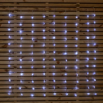 Create a magical atmosphere in your home or garden with this Light up Christmas Curtain Lights with Stars in White. Designed to captivate, these lights feature a charming star-style layout that adds a soft, festive glow wherever they're hung.. With 1.2 metre by 1.2 metre lit area, the curtain of lights is ideal for hanging across windows, along walls, or as a glowing backdrop for special occasions. Whether placed indoors or under a sheltered outdoor space, these lights create a wintery atmosphere with their crisp, white illumination. Fitted with multi-action LEDs, you can select from various lighting effects to match your mood – from gentle fades to sparkling flashes. The clear cable blends neatly into surroundings, letting the stars take centre stage. Mains powered with a 5 metre lead cable provides plenty of flexibility when positioning the curtain. Please note, the transformer must be kept indoors at all times.. Suitable for indoor and sheltered outdoor use.. Product Specifications. 108 Multi-Action White LEDs. 1.2m x 1.2m Lit Area. Mains Powered with a 5m Cable
