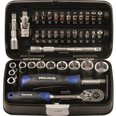 38 PIECE SET FOR VERSATILE APPLICATIONS The set includes a wide selection of sockets in various sizes as well as color-coded bits for slotted, Phillips and Torx screws. With this comprehensive set, you are well equipped for almost any screw application. TOOL BOX FOR EASY ORGANIZATION The sockets and bits come in a handy tool box that allows for clear arrangement and easy organization. The tool box is compact and durable, so you can safely store and transport your tools. COLOR CODED BITS FOR EASY IDENTIFICATION The bits are color coded to easily identify their size and screw head type. This allows for quick selection of the right bit for each screw and saves valuable time on your work. Applications: The kit is ideal for a variety of applications including repairs, assembly, installations and maintenance. It is suitable for use in the workshop as well as for DIY supplies. QUALITY CRAFTSMANSHIP Each socket and bit in this set is made of high quality chrome vanadium steel and precision hardened to ensure high durability and toughness. The bits are specially coated to ensure improved grip in screw heads., Weight: 2.0062065842 Pounds, Manufacturer: PROJAHN