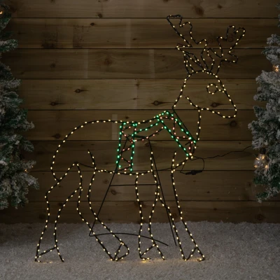 Create a magical winter display with this 1.4m x 86cm Light up FlexiBrights Standing Reindeer with LEDs. A captivating light decoration that blends tradition with modern LED brilliance. Whether placed by the Christmas tree, in a hallway, or outside on a sheltered porch, this eye catching figure is sure to bring warmth and wonder to your seasonal decor.. Standing tall at 1.4 metres high and 86cm long, this elegant reindeer is formed from a sturdy black metal frame and illuminated with a festive mix of 420 multi-coloured LEDs, featuring a vibrant combination of red, warm white, and green lights. Designed with both static and flashing light functions, this charming reindeer bring a festive charm to any display. Powered by mains electricity, it comes with a 5 metre lead cable to give you flexible placement options without the need for extension leads.. Suitable for indoor and sheltered outdoor use.. Product Specifications. 420 Red, Green and Warm White LEDs. Height: 1.4m Length: 86cm Width: 16m. Mains Powered with 5m Power Cable