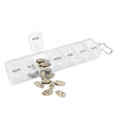 WEEKLY ORGANISATION: Features 7 individual compartments clearly marked with days of the week for systematic medication management SINGLE DOSE DESIGN: One compartment per day makes it perfect for once-daily medication, supplements, or vitamin routines PRACTICAL SIZE: Compact dimensions make it easy to store at home or carry whilst travelling, fitting neatly in bags or drawers CLEAR LABELLING: Large, easy-to-read text for each day helps prevent confusion and ensures proper medication scheduling VERSATILE STORAGE: Suitable for various types of medications, supplements, vitamins, and cod liver oil capsules