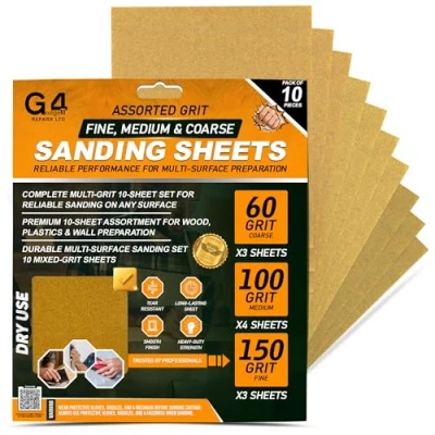 Each pack contains a mixture of Coarse (60), Medium (100) and Fine (150) that are suitable for sanding most surfaces around the home. Suitable For Working On Rough Walls, Resistant Plastics And Wood Suitable For Manual And Mechanical Sanders This assorted pack allows you to work down from a coarse Grit for basic surface preparation to fine Grit. The result can be a smooth finish. his pack includes 3 coarse sheets 3x fine Grit sheets, 4 x medium Grit sheets, . Suitable for use on wood, paint, varnish and plaster, Manufacturer: G4GADGET