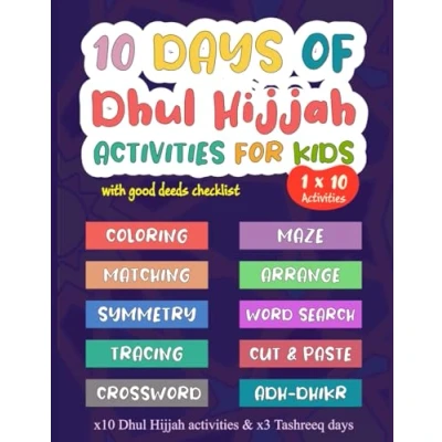 10 Days of Dhul Hijjah Activity Book for Kids: Dhu al Hijja + Tashreeq activities (Coloring, Tracing, Symmetry, Mazes, word Search, Cut & Paste, scramble, Matching, Crossword, ..)