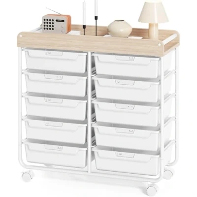 10 Drawers Rolling Cart with Wooden Tabletop, Utility Storage Wheels, Art Supply Craft Organizer on Wheel Metal Frame & Handles for Home Office School (White)