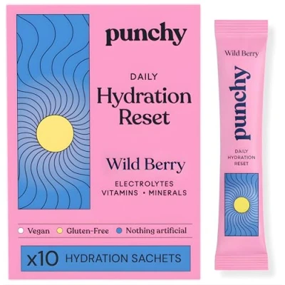 GET BACK ON TRACK - Reset your hydration with our game-changing wellness blend, featuring 7 essential electrolytes & minerals and 5 immunity-boosting vitamins. Crafted to refresh, restore and get you back on track for the next chapter of your day. GOOD HEALTH STARTS WITH HYDRATION - Most people are dehydrated without realising it. With many of us struggling to meet our daily water quota it can leave us feeling depleted in energy and focus so punchy’s nutritionist-approved range is a supercharged way to meet your needs. WORK, TRAVEL OR PLAY - Perfect for when you’re on-the-go, for a daily wellness fix, post-workout, recovery day or after party. Say goodbye to brain fog, tiredness, muscle fatigue and poor sleep amongst other symptoms of dehydration. CLEAN INGREDIENTS - All-natural ingredients, plant-based, low calorie, and caffeine-free. Unlike most other electrolyte sachets, our blends have a clean ingredients list with no artificial flavours or preservatives - without compromising on great taste. GAME-CHANGING BLEND - Each sachet is packed with Magnesium, Zinc, Potassium, Calcium, Sodium (Himalayan Pink Salt), Chloride and Phosphorus, as well as immunity-boosting Vitamin C, D, B3, B6 and B12. Pour in. Power on.