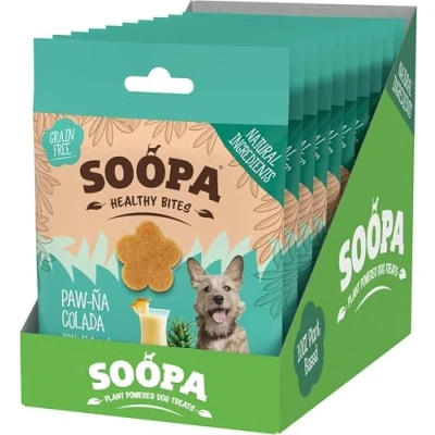 PUPTAILS COLLECTION: Raise a paw to our Soopa cool PUPTAILS collection; tail-wagging twists on classic cocktails. These bite-sized, healthy dog treats pack a flavour punch, are 100% plant-based, delicious, and perfect for training and rewarding. HUMAN-GRADE INGREDIENTS: Perfect for pups with sensitive tummies or allergies, Soopa training treats for dogs are easy to digest, and even help fight bad breath! Nothing artificial, just human-grade, vegan goodness, and only 3 calories per bite. PAW-NA COLADA: Anti-inflammatory coconut for brain, joint, skin & coat health, plus pineapple for improved digestion – these mini dog treats are suitable for pups with weight issues, allergies, CKD stages 1 and 2, liver disease, IBS, & low immunity. GRAIN FREE DOG TREATS: Packaged in a pocket-friendly pouch for walkies, these vet-approved, grain-free, low-fat, low-calorie, hypoallergenic, additive-free, yummy snacks are made with limited, all-natural ingredients (and plenty of love). SOOPA PETS: An eco-conscious, female-led Irish company, Soopa makes healthy, vegan, dog and puppy treats and chews from superfood ingredients, produced to human-grade standards. Simple, delicious, and nutritious. And the best bit? Dogs love them.