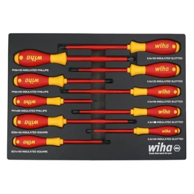 Set Includes: Slotted 3.5, 4.5, 4.5, 5.5, 6.5mm, Phillips #1, #2, #3, and Square: #1, #2 SoftFinish cushion grip handle for comfort and control Individually tested to 10,000 volts AC and rated to 1,000 volts AC Handle directly molded to the blade for permanent bond Parallel flats for roll-off prevention, Weight: 1.66 pounds, Manufacturer: Wiha