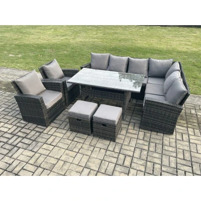 10 Seater Garden Rattan Furniture Corner Sofa Dining Table Chairs with 2 Small Footstools Indoor Outdoor Lounge Set Fimous
