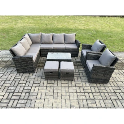 10 Seater High Back Outdoor Garden Furniture Set Rattan Corner Sofa With Rectangular Coffee Table 2 Small Footstools Armchairs Dark Grey Mixed