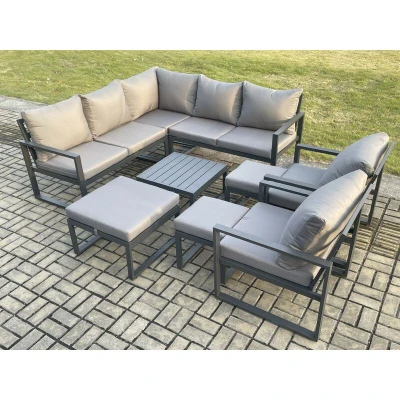10 Seater Outdoor Aluminium Garden Furniture Set Corner Lounge Sofa with Square Coffee Table 3 Footstools Dark Grey Fimous