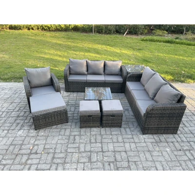 General description This 10-seater modern deluxe garden furniture set is perfect for various occasions. The strong and durable rattan construction ensures longevity, complemented by a tempered glass tabletop. Cushions are included, designed to fit the sofa's shape for enhanced comfort. This stylish set is ideal for showcasing any garden, patio, or conservatory. Technical specifications Set Dimensions: 1 x Side coffee table: 65L x 65W x 66H cm 1 x Big footstool: 65L x 65W x 34H cm 2 x Fully assembled small footstools: 40L x 40W x 34H cm 1 x Reclining chair: 74L x 67W x 79H cm 2 x 3-seater sofa: 177W x 67D x 79H cm 1 x Square coffee table: 65L x 65W x 34H cm Color: Dark grey mixed rattan with dark grey fabric Seat cushion thickness: 8 cm Installation Items come flat packed and are easy to assemble. Sturdy galvanized steel tube metal frames with powder coating to prevent rust. Usage Adjustable reclining chairs with an inclination range of 90°-130°. Removable cushion covers for easy