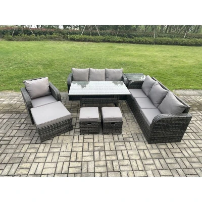 General description The Fimous 10 Seater Outdoor Rattan Garden Furniture Set is an excellent choice for enhancing your patio or garden. Constructed from high-quality PE rattan and durable galvanized steel, this furniture set is designed for sturdiness and longevity, making it suitable for outdoor use all year round. Technical specifications Set Dimensions: 1 x Side coffee table: 65L x 65W x 66H cm 1 x Big footstool: 65L x 65W x 34H cm 2 x Fully assembled small footstools: 40L x 40W x 34H cm 1 x Reclining chair: 74L x 67W x 79H cm 2 x 3-seater sofas: 177W x 67D x 79H cm 1 x Dining table: 140L x 80W x 69H cm Color: Dark grey mixed rattan with dark grey fabric Seat cushion thickness: 8 cm Armrest width: 9 cm Glass thickness: 5 mm clear tempered glass Installation Items come flat packed and are easy to assemble. The set features sturdy galvanized steel tube metal frames with powder coating to prevent rust. Usage The reclining armchair is adjustable, allowing you to change the back