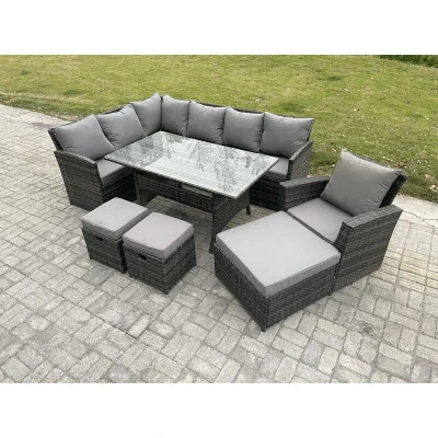 General description This outdoor garden furniture sofa set provides ample seating for 10 people, featuring a tempered glass dining table ideal for holding food, drinks, and more. It is a perfect addition to your patio, garden, backyard, pool, and other indoor and outdoor spaces. Technical specifications Big Footstool size: 65L x 65W x 34H cm Small footstools dimension: 40L x 40W x 34H cm (Fully Assembled) Chair size: 74W x 69D x 79H cm 3 Seater sofa with double armrest: 162L x 67W x 79H cm (Fully Assembled) 3 Seater sofa with single armrest: 157L x 67W x 79H cm (Semi-Assembled) Rectangular Dining Table dimension: 140L x 80W x 70H cm (Transparent tempered glass) Material: Dark grey mixed rattan with dark grey fabric Frame: Sturdy galvanized steel tube with powder coating to prevent rust Cushion thickness: 8 cm Installation Items come flat packed; self-assembly is necessary. Usage Low maintenance; removable cushion covers for easy cleaning. Recommended to keep cushions indoors or use a