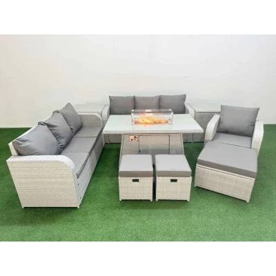 General description This Fimous 10 Seater Poly Rattan Outdoor Garden Furniture Set includes a firepit dining table, a 3-seater sofa, reclining chairs, stools, and side tables, all designed for comfort and style in your patio or garden. The set features light grey rattan with dark grey fabric, providing a modern aesthetic that complements any outdoor space. Technical specifications Reclining chair size: 74W x 69D x 79H cm 3-seater sofa size: 177W x 67D x 79H cm (2 units) Big footstool size: 65L x 65W x 34H cm Fully assembled stool size: 40W x 40D x 34H cm (2 units) Side table size: 65L x 65W x 66H cm (2 units) Firepit dining table size: 140L x 80W x 69H cm Sofa weight capacity: 250 kg Table weight capacity: 80 kg Material: PE rattan, galvanized steel frame with powder coating Cushion thickness: 8 cm Installation Items come flat packed and are easy to assemble. Ensure to check the product carefully before signing for delivery, and report any obvious damage upon arrival. Usage For