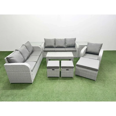 General description This deluxe PE rattan sofa set is an excellent addition to your patio or garden, crafted from high-quality PE rattan and durable galvanized steel. The set includes a reclining chair, two 3-seater sofas, stools, and side tables, all designed for comfort and style. Technical specifications Reclining chair size: 74W x 69D x 79H cm 3-seater sofa size: 177W x 67D x 79H cm (2 units) Big footstool size: 65L x 65W x 34H cm Fully assembled stool size: 40W x 40D x 34H cm (2 units) Side table size: 65L x 65W x 66H cm (2 units) Table size: 105L x 50W x 48H cm Sofa weight capacity: 250 kg Table weight capacity: 80 kg Color: Light grey rattan with dark grey fabric Installation Items come flat packed and are easy to assemble. Usage Adjustable armchairs with a back inclination range of 90°-130°. Low maintenance with removable cushion covers. Recommended to keep cushions indoors or use a rain cover when not in use. Other information 5mm thick transparent tempered glass with suckers