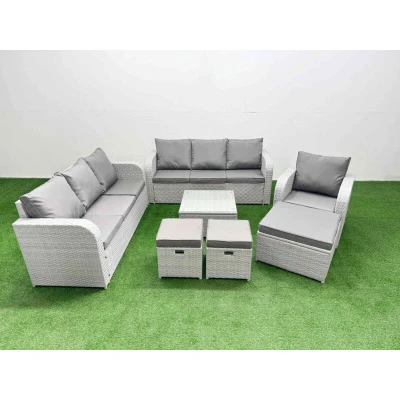 General description This deluxe PE rattan sofa set is an excellent addition to your patio or garden, crafted from high-quality PE rattan and durable galvanized steel. The set includes a variety of seating options and a coffee table, providing comfort and style for outdoor gatherings. Technical specifications Reclining chair size: 74W x 69D x 79H cm 3-seater sofa size: 177W x 67D x 79H cm (2 units) Big footstool size: 65L x 65W x 34H cm Fully assembled stool size: 40W x 40D x 34H cm (2 units) Table size: 65L x 65W x 34H cm Sofa weight capacity: 250 kg Table weight capacity: 80 kg Seat cushion thickness: 8 cm Glass thickness: 5 mm (tempered) Installation Items come flat packed and are easy to assemble. Usage Adjustable armchairs with a back inclination range of 90°-130°. Low maintenance with removable cushion covers. Recommended to keep cushions indoors or use a rain cover when not in use. Use a rain cover for the furniture if not in use for an extended period. Other information Factory