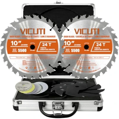 Precision Engineering: VICUTI 10-inch dado blade set delivers clean, accurate dados, grooves, and rabbets for flawless cuts in every project. Universal Compatibility: Designed to fit table saws ranging from 1/4'' to 13/16'', this set works seamlessly with a variety of woodworking setups. Comprehensive Kit: Includes 2 outer blade(10''), 4chippers(1/8''), 1 chipper(1/16''), and an adjustable shim set for customizable cuts on any woodwoorking project. Exceptional Durability: Made from high-quality carbide, this blade set is built to last, providing outstanding performance and long-lasting sharpness even after prolonged use. Ideal for Woodwordkers: Whether you are a professional or a DIY enthusiast, this dado blade set is the prefect tool to achieve precise joinery and exceptional results on all your woodworking projects.