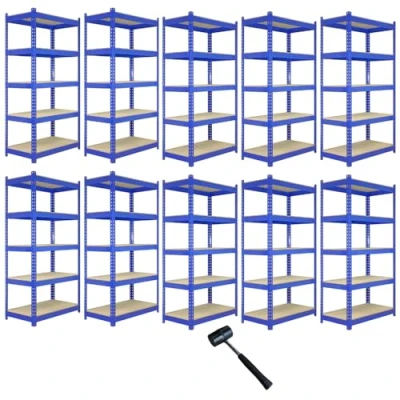 10 x Blue Racking Bay Unit 5 Tier Heavy Duty Steel Metal 200kg capacity Per Shelf Garage Shelves Storage Warehouse Shed Workshop Boltless Shelving 120 50 180cm Free Rubber Mallet