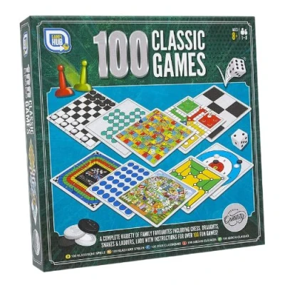 Enjoy fun games with friends and family with this classic collection of 100 board games. Filled with a variety of family favourites including chess, draughts, snakes & ladders and ludo. Perfect birthday or Christmas gift for anyone you know who loves playing board games.. The board game set includes 5 x double-sided playing boards, 32 x chess/checkers pieces, 16 x ludo pieces, 40 x match sticks, 5 x dice and instructions.. 100 Classic Board Games. Ages 8+. 1-8 players. Family favourite games. Includes 5 playing boards