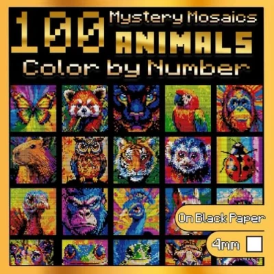 100 Color by Number Animals: Mystery Mosaics: Animal Coloring Book for Adults with Dazzling Hidden Images, Quest on Black Paper (100 Quest)