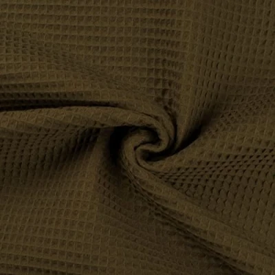 CRS Fur Fabrics Hight Quality 100% Cotton Khaki Color known as waffle weave fabric or honeycomb fabric Is a woven fabric that has a recessed pattern created by cords running either vertically, horizontally or both, creating a square design Suitable for curtains and upholstery, craft applications, bags, hand towels, dish towels, cleaning cloths, aprons, pyjamas, robes, slippers, cushions and other art or sewing projects