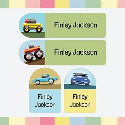 100 x Personalised Stick On Waterproof Name Labels Pack of 2 Sizes for Clothes, Water Bottles, School Uniform, Equipment Turbo Cars (SFP)
