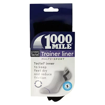 1000 Mile Men's Trainer Liner Sock Double LayerIntroducing the 1000 Mile Tactel® Trainer Sock, a discreet double-layer sock in a shorter style. Its Tactel® inner layer protects against friction and wicks away moisture for a cool and dry foot. The combination of fibers and top venting maintains a comfortable temperature, while arch bracing provides extra support. Our unique BLISTER-FREE GUARANTEE ensures reduced friction, less wear, and blister prevention. Shaped to match trainer shoes, it features a higher tab to protect the ankle and Heel Power technology to prevent slipping. Tactel® is a soft, lightweight, and fast-drying fiber, keeping your feet cool during activity. Choose the same size as your foot, opting for a smaller size if you have a narrow fit.Available men's sizes: M (6-8.5 UK/EUR 39-42.5), L (9-11.1 UK/EUR 43-46.5), XL (12-14 UK/EUR 47-49). Materials: Outer layer(65% cotton, 34% nylon, 1% Elastane Lycra®); Inner layer (100% Tactel®).Experience superior comfort and protection with our expertly crafted socks.Extra Product DetailsDouble layer construction for protection and moisture-wickingComfortable temperature with top venting and arch bracingBlister-free guarantee with reduced friction and wearShaped to fit trainer-style shoes with ankle protectionHeel Power technology prevents sock slippingTactel® fiber is soft, breathable, and lightweightQuick-drying and moisture-wicking properties keep feet cool and drySize guide ensures a snug and wrinkle-free fit.