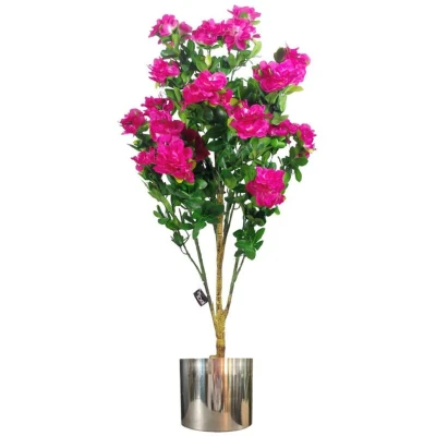 100cm Premium Artificial Azalea Pink Flowers Potted Plant with Silver Metal Planter