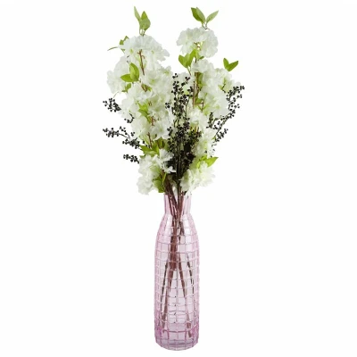 These artificial flower arrangements come with the vases a complete pack of everything you need to create the display shown in our photos. When arranged as we have it shown in our photos this measures 100cm x 45cm x 45cm. Stems are wired and this can be shaped to your requirements This pack contains the following: 1 x LEAF-40593 49cm tall pink square glass vase 49cm tall x 15cm x 15cm at widest points and the slightly narrower top rim measures 9. 5cm diameter. 3 x LEAF-40651-PURPLE 85cm artificial dark berry stem. 6 x LEAF-40691 100cm white artificial silk blossom stem. . High quality product by Leaf Design UK. Flowers and foliage are supplied loose at full length ready for you arrange. You can cut these shorter if wanted for arrangement (very easy- just use wire cutters) or you can just fold the stems at the ends before putting them in the vase. . We also supply all these components separately if you want to add to your arrangement.