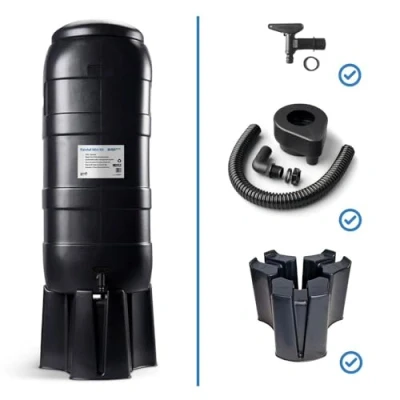100L Slimline Black Water Butt Kit: A good balance of being substantial without being too bulky. 100L is the average required for most homes able to fill over 10 large watering cans (10L). Once collected in this slimline water butt, rainwater can be used to water your garden, clean household or outdoor equipment Complete Kit: Easy to move, and set up, the lightweight design can be relocated easily and secured in place with its compact size. It comes with all the parts you need, stand, Lid, Easy Hose Connect Tap & Diverter for Garden Water Storage ready to go and no surprises Size Dimensions Water Butt: L35cm x W35cm x H97cm, STAND: W38cm x H29cm | Compact and efficient for tight spaces Fully UV Stabilised: Protects the unit from long-term degradation from UV light ensuring durability and longevity in outdoor conditions Sustainability and Cost Savings: As with all water butts, quickly save money from hiking water bills by utilising nature's water for your gardening and outdoor needs