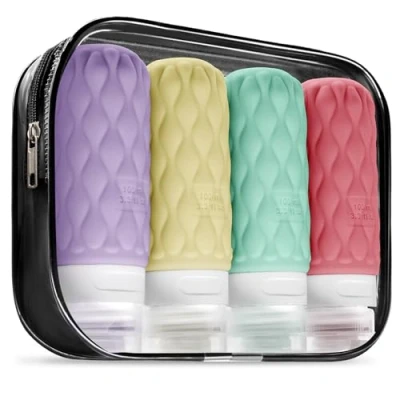Amazon Carry-On Approved: Our 100 ml silicone travel bottles for toiletries meeting TSA Approved with travel hassle-free. Perfect for shampoo, conditioner, lotion, hand sanitizer and more. Includes a superior quality transparent wash bag with a zipper for easy organization during long journeys Skin-friendly Material: Made of Silicone which soft, flexible instead of hard like traditional plastic travel bottles, our travel bottles containers are safe for all travel toiletries. Perfect for shampoo, conditioner, lotions, liquid soap, shower gel Easy to Fill and Clean: Featuring a spacious opening, our refillable travel bottles make it effortless to fill up with shampoo, conditioner, lotion, or any liquid of choice. Cleaning is a breeze with the wide opening accommodating a brush for thorough maintenance No-Drip Valve: Designed with a no-drip valve, our bottle caps prevent leaks with a small intersection for tidy dispensing. Say goodbye to messy spills and confidently carry your toiletries knowing they are securely sealed in our travel bottles 100 ml Travel Bottles: Our Travel Bottle Set includes 4 Pack 100 ml/3.4 oz Silicone Travel Bottle, 1 Clear Zipper Toiletry Bag, 1 Sticker Containers Travel Labels (The included labels make it easier to identify different contents)