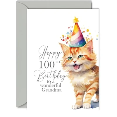 Make them smile with this special birthday card - This exceptional quality birthday card for her shows the design Party Cat Kitten saying 'Happy 100th Birthday'. If you are looking for awesome birthday greetings cards for women or 100th birthday card for her then then this happy birthday card is bound to make her smile. Not just for friendship gifts for women this could also be a birthday card for Grandma, Step Grandma, Gran, Granny or Grandma in Law. What's Inside - Print showcasing a lovely verse, 'Wishing You A Very Happy Birthday' as seen in the second image. There's ample space for your own personal message. Crafted on a 360-micron thick environmentally responsible board, this one-sided gloss board offers a luxurious look and feel. Paired with a colored gummed envelope that complements the design, it's ready to be sealed and sent, making it a truly special birthday gesture. Ink Perfection: Say goodbye to ink smudges! Our high-quality one-sided coated board ensures a smooth writing experience without the worry of smudging. The uncoated side absorbs ink, providing a flawless finish that adds to the card's overall premium quality.Grandma birthday card adults, 100th birthday card Grandma, special Grandma birthday cards, Grandma 100th birthday cards, female birthday cards. Dimensions that Impress: Greet with grandeur using a card sized at 148mm x 210mm, accompanied by an envelope measuring 150mm x 212mm. The card boasts a thickness of 360 microns, ensuring a substantial and impressive presence.Grandma birthday cards from Granddaughter or Grandson. Great Grandma card birthday, Grandma birthday cards for women, happy birthday Grandma, Grandmas birthday card adults. British Craftsmanship: Proudly crafted and quality-checked in the UK, our birthday cards are a testament to expert design and manufacturing. Utilizing Forest Stewardship Council certified board, we contribute to responsible forest management. Expect a swift turnaround and a product that reflects the highest standards of quality. Wonderful Grandma birthday cards, fabulous female birthday cards.