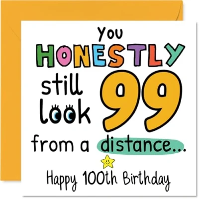 MAKE THEM SMILE WITH THIS UNIQUE BIRTHDAY CARD: This exceptional quality birthday card for him or her shows the design 'You Honestly still look 99 from a distance Happy 100th Birthday'. If you are looking for special birthday greetings cards for Men birthday card then then this happy birthday card is bound to make them smile. Not just for birthday gifts for Men this could also be for Nan, Uncle, Dad, Wife, Grandma, Husband, Grandad or Auntie. WHAT DO YOU GET: The card is printed on one side and BLANK ON THE INSIDE to allow you to write your very own message. The unique fun design is printed on a specially sourced and environmentally responsible board. At 360 microns thick the natural white one-sided gloss board has a quality look and feel. Supplied with a coloured gummed envelope to complement the design and ready to be sealed and sent in the post. Great Nan birthday cards, Uncle birthday card. NO INK SMUDGES: There is nothing worse than writing inside a card to find that the shiny surface makes the ink smudge. This is why we use a high quality one sided coated board. The uncoated side will absorb more of the ink from your pen to make smudging a thing of the past. 100th Birthday card for Dad, 100th Birthday card for Wife, 100th Birthday card for Grandma. SIZES: Greeting Card = 145mm x 145mm, Envelope = 155mm x 155mm, Card Thickness = 360 micron. Husband 100th birthday card, birthday cards for Grandad, special birthday cards for Auntie, 100th birthday card Nan, Uncle 100th birthday card. MADE AND QUALITY CHECKED IN THE UK: We print and manufacture all our products right here in the UK so you can be sure of a fast turnaround and a product that is expertly made. Using environmentally responsible premium board our card is conscious of the responsible management of the world's forests - perfect birthday cards for Men, fun birthday cards for him, Uncle 100th birthday cards, female birthday cards.