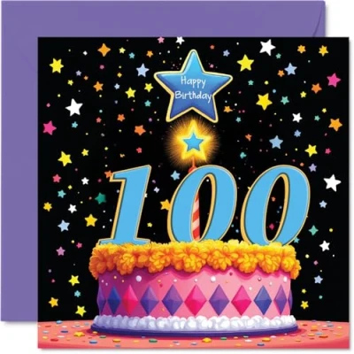 MAKE THEM SMILE WITH THIS UNIQUE BIRTHDAY CARD: This exceptional quality birthday card for him or her shows the design 'Happy Birthday 100'. If you are looking for special birthday greetings cards for Men birthday card then then this happy birthday card is bound to make them smile. Not just for birthday gifts for Men this could also be for Nan, Grandma, Husband, Dad, Wife, Nanny, Grandad or Auntie. WHAT DO YOU GET: The card is printed on one side and BLANK ON THE INSIDE to allow you to write your very own message. The unique fun design is printed on a specially sourced and environmentally responsible board. At 360 microns thick the natural white one-sided gloss board has a quality look and feel. Supplied with a coloured gummed envelope to complement the design and ready to be sealed and sent in the post. Great Nan birthday cards, Grandma birthday card. NO INK SMUDGES: There is nothing worse than writing inside a card to find that the shiny surface makes the ink smudge. This is why we use a high quality one sided coated board. The uncoated side will absorb more of the ink from your pen to make smudging a thing of the past. 100th Birthday card for Husband, 100th Birthday card for Dad, 100th Birthday card for Wife. SIZES: Greeting Card = 145mm x 145mm, Envelope = 155mm x 155mm, Card Thickness = 360 micron. Nanny 100th birthday card, birthday cards for Grandad, special birthday cards for Auntie, 100th birthday card Nan, Grandma 100th birthday card. MADE AND QUALITY CHECKED IN THE UK: We print and manufacture all our products right here in the UK so you can be sure of a fast turnaround and a product that is expertly made. Using environmentally responsible premium board our card is conscious of the responsible management of the world's forests - perfect birthday cards for Men, fun birthday cards for him, Grandma 100th birthday cards, female birthday cards.