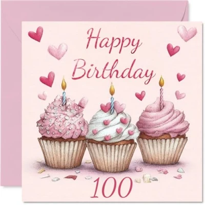 100th Birthday Cards for Women Men Pink Cupcakes Happy Card 100 Year Old Woman Man Wife Nan Dad Uncle, 145mm Bday Greeting