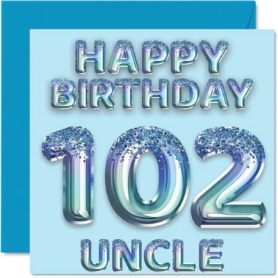 MAKE YOUR UNCLE SMILE WITH THIS AWESOME BIRTHDAY CARD: This exceptional quality birthday card for him shows the design of blue glitter balloons stating 'Happy Birthday 102' Uncle'. If you are looking for funny birthday cards for men, then then this happy birthday card is bound to make them laugh. Not just for friendship gifts for men this could also be for Uncle or Step Uncle. WHAT DO YOU GET: The card is printed on one side and BLANK ON THE INSIDE to allow you to write your very own message. The unique fun design is printed on a specially sourced and environmentally responsible board. At 360 microns thick the natural white one-sided gloss board has a quality look and feel. Supplied with a coloured gummed envelope to complement the design and ready to be sealed and sent in the post. Birthday card for Uncle, 102nd birthday card for him. NO INK SMUDGES: There is nothing worse than writing inside a card to find that the shiny surface makes the ink smudge. This is why we use a high quality one sided coated board. The uncoated side will absorb more of the ink from your pen to make smudging a thing of the past. Uncle birthday cards, birthday card cute, 102nd birthday gifts for Uncle, Uncle birthday cards. SIZES: Greeting Card = 145mm x 145mm, Envelope = 155mm x 155mm, Card Thickness = 360 micron. Great Uncle birthday cards from Niece and Nephew, male birthday card, 102nd birthday card, happy birthday Uncle cards, family birthday card. MADE AND QUALITY CHECKED IN THE UK: We print and manufacture all our product right her in the UK so you can be sure of a fast turnaround and a product that is expertly made. Using environmentally responsible premium board our card is conscious of the responsible management of the world's forests.