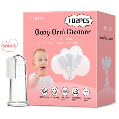 đăFocus On Early Baby Oral CareăOur baby toothbrush helps to solve the baby's oral health problem, effectively removes oral stains, milk stains, tongue coating, and keeps the mouth clean. Begin early with this delicate tongue brush to develop good oral hygiene habits for babies and infants. đăProfessinal Designă3D wave soft brush head made of 100% medical skim gauze can clean the mouth 360°, making cleaning easier. â€Soft absorbent gauze is comfortable to use, fit baby's gums, no fluorescent whitening agent, no taste. â„The Paper handle is sturdy, flexible and enough long to easily reach every part of your babyâs mouth. đăStable & Safe to UseăThe perfectly sized lattice structure and double suture fastening structure are against falling off, that's why our tongue cleaner is so stable. Our baby toothbrush also can massage the gums and help soothe teething pain. Baby would love teething massage and enjoy it. đăIndependent Vacuum PackingăEach baby gum cleaner is sanitized and hermetically sealed for disposable use. Theyâre ready to use and you can keep a few in your purse or diaper bag and use it wherever you are. â2 ways to use-Unpack and use directly & dip warm water 30°C. â„ We recommend cleaning your baby's tongue and gums daily, even without teeth. đăYour Best Choice for Newborn GiftsăBaby First Toothbrush and newborn toothbrush 0-3 months, Package includes infant toothbrush 102PCS+ FREE 1Pcs soft finger toothbrush with case, suitable for 0-36 Month Baby. â„ If you have any questions about this product, please contact us for replacement or refund.