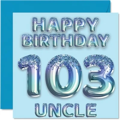 MAKE YOUR UNCLE SMILE WITH THIS AWESOME BIRTHDAY CARD: This exceptional quality birthday card for him shows the design of blue glitter balloons stating 'Happy Birthday 103' Uncle'. If you are looking for funny birthday cards for men, then then this happy birthday card is bound to make them laugh. Not just for friendship gifts for men this could also be for Uncle or Step Uncle. WHAT DO YOU GET: The card is printed on one side and BLANK ON THE INSIDE to allow you to write your very own message. The unique fun design is printed on a specially sourced and environmentally responsible board. At 360 microns thick the natural white one-sided gloss board has a quality look and feel. Supplied with a coloured gummed envelope to complement the design and ready to be sealed and sent in the post. Birthday card for Uncle, 103rd birthday card for him. NO INK SMUDGES: There is nothing worse than writing inside a card to find that the shiny surface makes the ink smudge. This is why we use a high quality one sided coated board. The uncoated side will absorb more of the ink from your pen to make smudging a thing of the past. Uncle birthday cards, birthday card cute, 103rd birthday gifts for Uncle, Uncle birthday cards. SIZES: Greeting Card = 145mm x 145mm, Envelope = 155mm x 155mm, Card Thickness = 360 micron. Great Uncle birthday cards from Niece and Nephew, male birthday card, 103rd birthday card, happy birthday Uncle cards, family birthday card. MADE AND QUALITY CHECKED IN THE UK: We print and manufacture all our product right her in the UK so you can be sure of a fast turnaround and a product that is expertly made. Using environmentally responsible premium board our card is conscious of the responsible management of the world's forests.