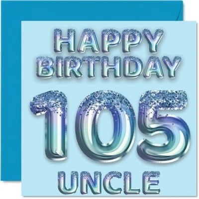 MAKE YOUR UNCLE SMILE WITH THIS AWESOME BIRTHDAY CARD: This exceptional quality birthday card for him shows the design of blue glitter balloons stating 'Happy Birthday 105' Uncle'. If you are looking for funny birthday cards for men, then then this happy birthday card is bound to make them laugh. Not just for friendship gifts for men this could also be for Uncle or Step Uncle. WHAT DO YOU GET: The card is printed on one side and BLANK ON THE INSIDE to allow you to write your very own message. The unique fun design is printed on a specially sourced and environmentally responsible board. At 360 microns thick the natural white one-sided gloss board has a quality look and feel. Supplied with a coloured gummed envelope to complement the design and ready to be sealed and sent in the post. Birthday card for Uncle, 105th birthday card for him. NO INK SMUDGES: There is nothing worse than writing inside a card to find that the shiny surface makes the ink smudge. This is why we use a high quality one sided coated board. The uncoated side will absorb more of the ink from your pen to make smudging a thing of the past. Uncle birthday cards, birthday card cute, 105th birthday gifts for Uncle, Uncle birthday cards. SIZES: Greeting Card = 145mm x 145mm, Envelope = 155mm x 155mm, Card Thickness = 360 micron. Great Uncle birthday cards from Niece and Nephew, male birthday card, 105th birthday card, happy birthday Uncle cards, family birthday card. MADE AND QUALITY CHECKED IN THE UK: We print and manufacture all our product right her in the UK so you can be sure of a fast turnaround and a product that is expertly made. Using environmentally responsible premium board our card is conscious of the responsible management of the world's forests.