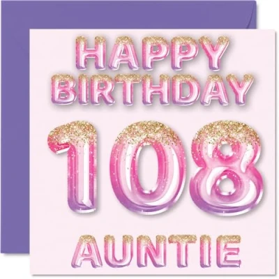 108th Birthday Card for Auntie Pink & Purple Glitter Balloons Happy Cards 108 Year Old Aunt Aunty from Nephew Niece, 145mm x Bday Greeting Gift