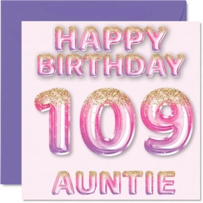 109th Birthday Card for Auntie Pink & Purple Glitter Balloons Happy Cards 109 Year Old Aunt Aunty from Nephew Niece, 145mm x Bday Greeting Gift