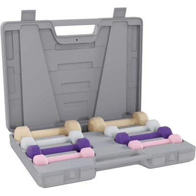 General description Build up your workouts or simply vary them with this weights set from HOMCOM. This set includes pairs of dumbbells in bright colors, making exercise fun and engaging. The easy-read weight numbers on both ends enhance usability. Technical specifications Colour: Pink, Purple, Grey, Brown Material: Metal, PU, Plastic Overall Dimension: 41W x 30D x 8H cm Dumbbell Dimensions: Φ5 x 12.5H cm, Φ6 x 13H cm, Φ6.5 x 15H cm, Φ7.5 x 16H cm Weights: 0.5kg, 1kg, 1.5kg, 2kg Net Weight: 10.5kg Usage Suitable for lifting Cardio workouts Yoga Squats Other information Set includes a carry case Each piece is protected with PU casing Rounded shape for easy handling and prevents rolling away