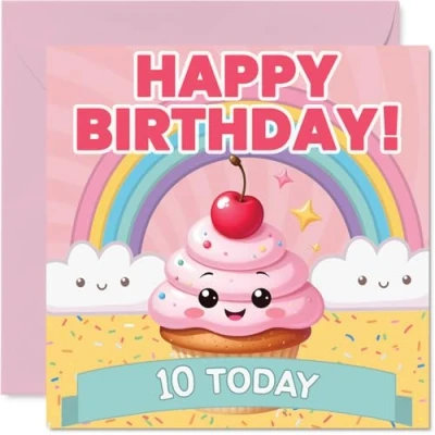 10th Birthday Cards for Girls Rainbow Cupcake Fairy Cake Happy Card 10 Year Old Girl Daughter Granddaughter Great Niece Sister, 145mm Bday Greeting