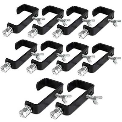 Comprehensive bundle of ten robust BeamZ CC50B G-clamp lighting hooks, designed specifically for securely mounting disco equipment, stage lights, and special-effect units onto truss stands. Strong, heavy-duty metal build ensures a reliable hold, safely supporting lighting fixtures or smoke machines weighing up to 30kg, ideal for event productions, DJs, and professional installations. Easily adjustable screws allow quick fitting and removal on poles and trussing, ensuring efficient set-up and dismantling times for travelling entertainment professionals or rental companies. Each clamp fits poles up to 50mm diameter, making this an adaptable mounting solution suitable for various truss stands, stage frameworks, and equipment supports across diverse setups and venues. Sleek, discreet black finish integrates seamlessly into professional stage environments, providing neat, unobtrusive fixture placement ideal for theatre performances, nightclubs, DJs, and events.