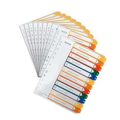 1-12 index for the clear organisation of A4 documents, helps in keeping track of important notes or school paperwork; for home, school or office use Coloured tabs for clear classification of documents; universal punched filing strip for easy filing in all types of binders and files Easy to update index by hand or using Leitz easyprint templates Organize your home and office with this and other products from Leitz; wipe clean plastic surface durable and tear resistant Contents: One A4 Esselte 1-12 index, plastic, 12940000, W x H x D: 24.5 x 30.5 x 0.4 cm; colour - white/multi-coloured; weight: 0.27 kg