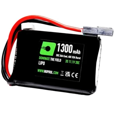 STATS - LiPo | 11.1v | 1300 mAh | 20C/40C @ 26A/52A (Cont/Burst) - Airsoft AEGs use the "Burst" flow rate to start the motor, and then the "Cont" flow rate to provide continuous discharge (check your owners manual to ensure the battery purchased meets the minimum flow rate (C) of your AEG) - this battery provides approximately 3 minutes of continuous discharge before running flat LITHIUM POLYMER - LiPo batteries have an excellent size/weight to capacity ratio, allowing you to fire more shots with a smaller battery. LiPo batteries can be recharged at any charge level without damaging the overall capacity of the battery. LiPo batteries should not be "run-flat", as this can damage the battery and effect overall charge ability. LiPo batteries MUST be charged with a LiPo Balance Charger. LiPo batteries should always be charge in a fire-retardant Safe-Charging-Bag PEQ15/ Battery Box - this battery is designed to fit within externally mounted battery boxes. Always check the dimensions of the battery vs the battery compartment to ensure compatability MINI TAMIYA - this battery is suitable for Airsoft Replicas using a Mini-Tamiya battery connector QUALITY CONTROL - NP Power batteries are produced at an ISO 9000 Quality Control accredited manufacturing plant and shipped at an optimal charge rate of ≥60% to protect against degradation when in transport/ storage