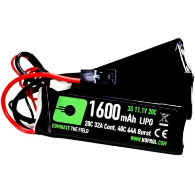 STATS - LiPo | 11.1v | 1600 mAh | 20C/40C @ 32A/64A (Cont/Burst) - Airsoft AEGs use the "Burst" flow rate to start the motor, and then the "Cont" flow rate to provide continuous discharge (check your owners manual to ensure the battery purchased meets the minimum flow rate (C) of your AEG) - this battery provides approximately 3 minutes of continuous discharge before running flat LITHIUM POLYMER - LiPo batteries have an excellent size/weight to capacity ratio, allowing you to fire more shots with a smaller battery. LiPo batteries can be recharged at any charge level without damaging the overall capacity of the battery. LiPo batteries should not be "run-flat", as this can damage the battery and effect overall charge ability. LiPo batteries MUST be charged with a LiPo Balance Charger. LiPo batteries should always be charge in a fire-retardant Safe-Charging-Bag NUNCHUCK - this battery is split to help find its place in small battery compartments. Commonly fitted inside the buttstock of rear wired Airsoft Replicas where the buffer tube is not hollow (example EBB - Electric-Blow-Back AEGs). Also for fitting around the barrel, within the handguard of front wired Airsoft Replicas. Always check the dimensions of the battery vs the battery compartment to ensure compatability MINI TAMIYA - this battery is suitable for Airsoft Replicas using a Mini-Tamiya battery connector QUALITY CONTROL - NP Power batteries are produced at an ISO 9000 Quality Control accredited manufacturing plant and shipped at an optimal charge rate of ≥60% to protect against degradation when in transport/ storage