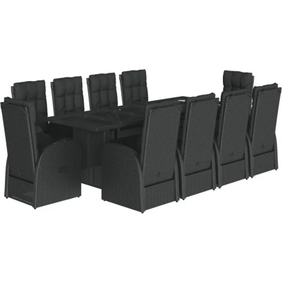 ManoManoGeneral description This 11 Piece Garden Dining Set with Cushions is perfect for al fresco dining or simply relaxing in your garden, backyard, or patio. Made from durable PE rattan, this set combines style and functionality, making it an excellent addition to your outdoor space. Technical specifications Maximum weight capacity (per seat): 110 kg UV-resistant Assembly required: Yes Garden table: Colour: Black Material: PE rattan, powder-coated steel, tempered glass Dimensions: 240 x 90 x 75 cm (L x W x H) Garden reclining chair: Colour: Black Material: PE rattan, powder-coated steel Sitting dimensions: 57 x 69 x 106 cm (W x D x H) Lying down dimensions: 57 x 106/133 x 85/90 cm (W x D x H) Seat size: 47 x 50 cm (W x D) Seat height from the ground: 41 cm Armrest height from the ground: 63.5 cm Cushion: Colour: Black Cover material: Fabric (100% polyester) Seat cushion filling material: Foam Seat cushion dimensions: 47 x 50 x 4 cm (W x D x T) Compatibility and accessories Delivery