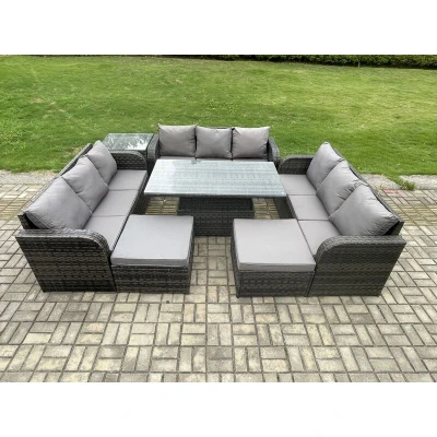 11 Seater Garden Dining Sets Outdoor Rattan Furniture Lounge Sofa Height Adjustable Rising lifting Table With Side 2 Big Footstool Dark Grey