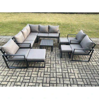 11 Seater Outdoor Aluminium Garden Furniture Set Corner Lounge Sofa with Square Coffee Table Chair 3 Footstools Dark Grey Fimous
